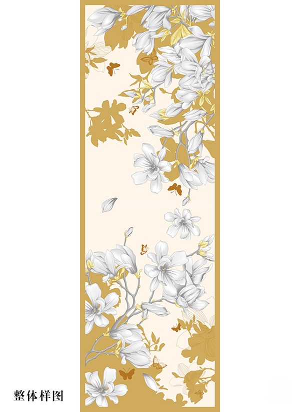 将盛开的玉兰花与翩翩起舞的蝴蝶巧妙结合。玉兰花,高洁之花,象征着纯洁无瑕、玉堂富贵。蝴蝶,以其轻盈的姿态和美丽的外表,寓意着自由美好、长寿福迭。
