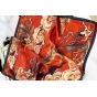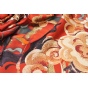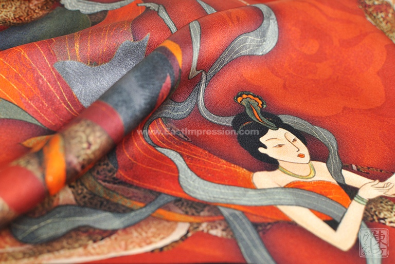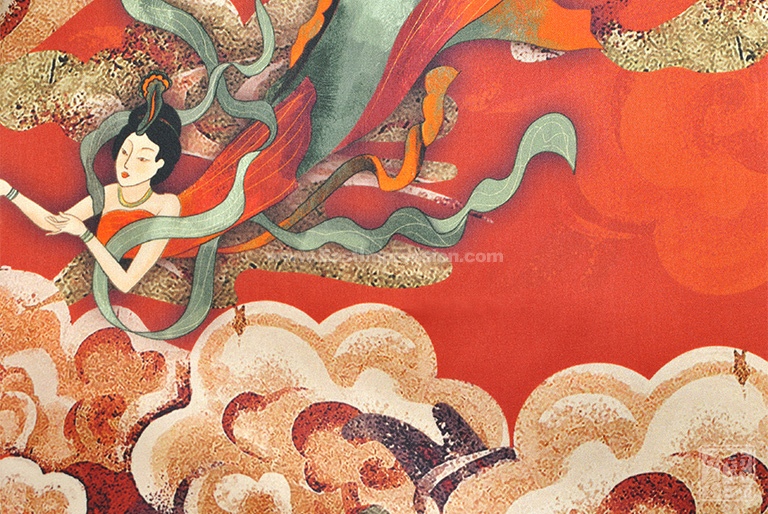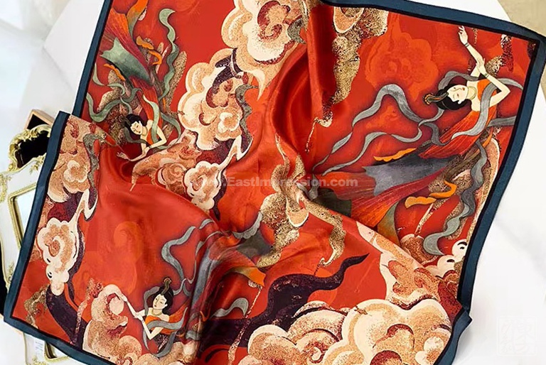 色挟石榴之红,裙带美人之姿。丝巾以中国传统色“石榴裙”为主色调,飞天仕女宛若云中仙子,飘飘的衣袂以油绿、墨灰色装点,周遭祥云缭绕,引领着观者进入一个既神秘又绚烂的艺术境界。