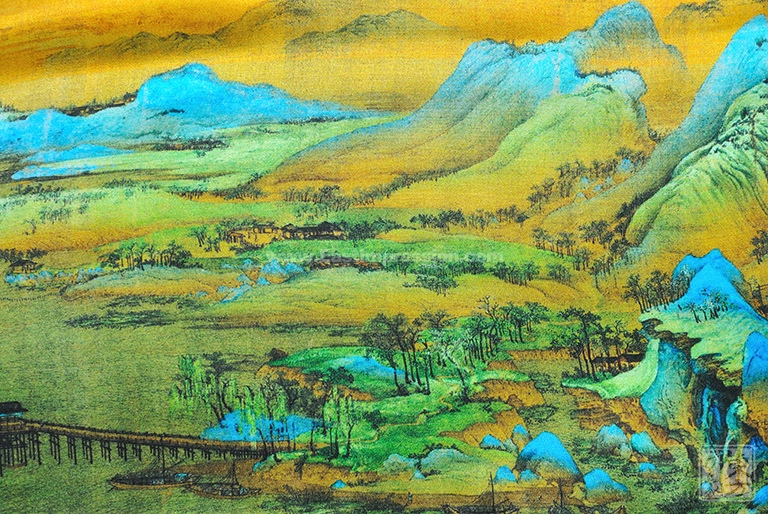 《千里江山图》是宋代青绿山水画中具有突出艺术成就的代表作。该画卷中的“青绿山水”,是用矿物质的石青、石绿上色,使山石显得厚重、苍翠,画面爽朗、富丽,色泽强烈、灿烂。有时山石轮廓加泥金勾勒,增加金碧辉煌效果,被称为“金碧山水”。它是隋唐时期随着山水画日趋成熟、形成独立画科时,最早完善起来的一种山水画形式。2017年2月25日,中国邮政集团公司发行了《千里江山图》特种邮票通景版票一套9枚。