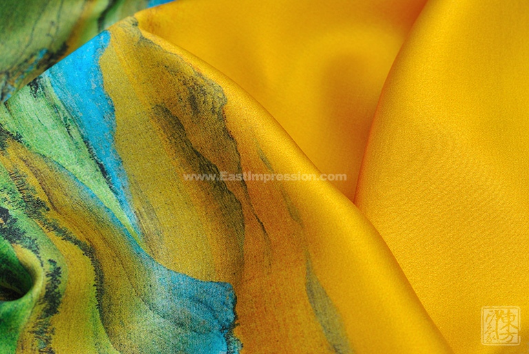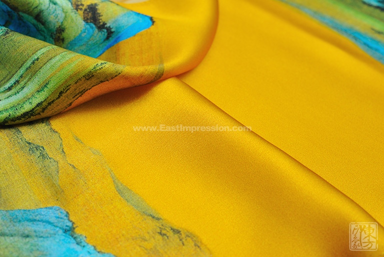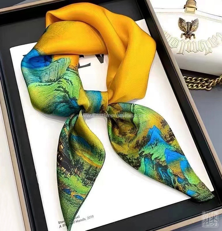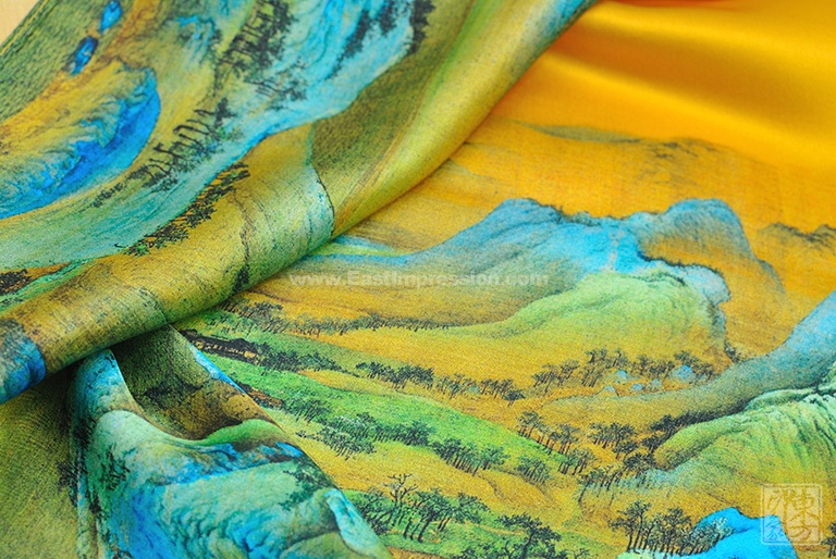 数码喷印《千里江山图》再现其鲜妍敷色,恢弘壮观,江山千里的大气象。佩戴在身犹如行走的丝绸艺术品,为女性增添古典雍容的气韵。