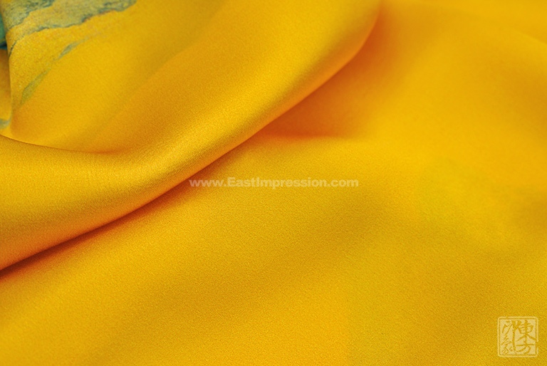 丝巾面料为12姆米真丝素绉缎,散发出自然柔和的丝绸光泽,表面平整光洁,触感细腻丝滑。