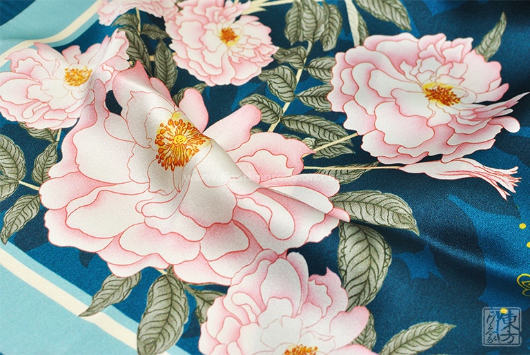 丝巾面料为14姆米真丝素绉缎,散发出自然柔和的丝绸光泽,表面平整光洁,触感细腻丝滑。