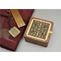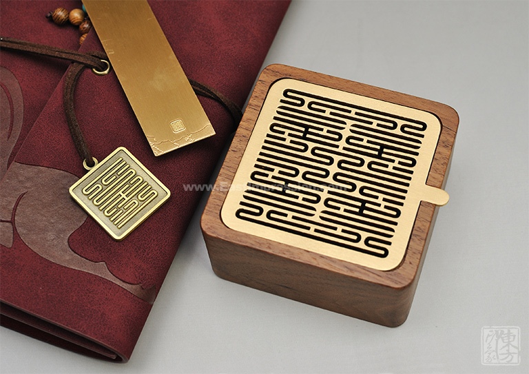 玺印风格的盘香盒,以四方圆弧的黑胡桃木为基座,嵌入镂空篆书纹样的黄铜上盖,古典韵味与实用功能兼而有之。