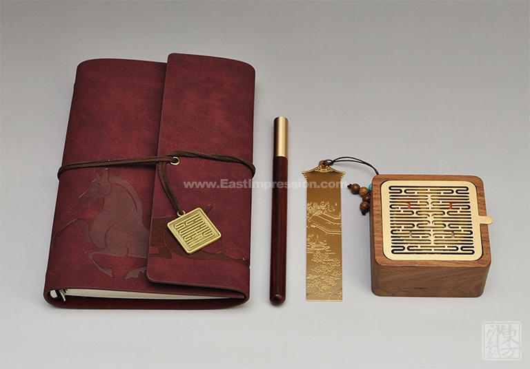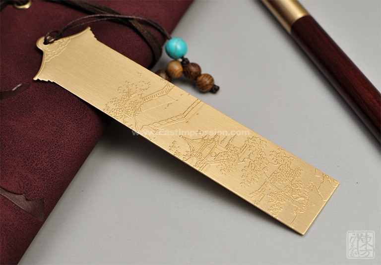 书签外形纤巧修长,顶部取江南民居“马头墙”的优美线条,以浮雕如意云纹装点。