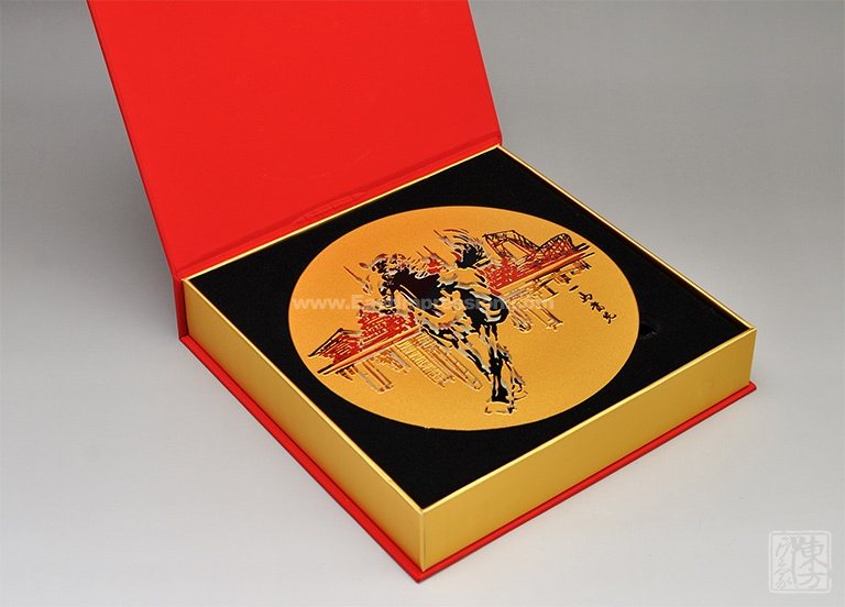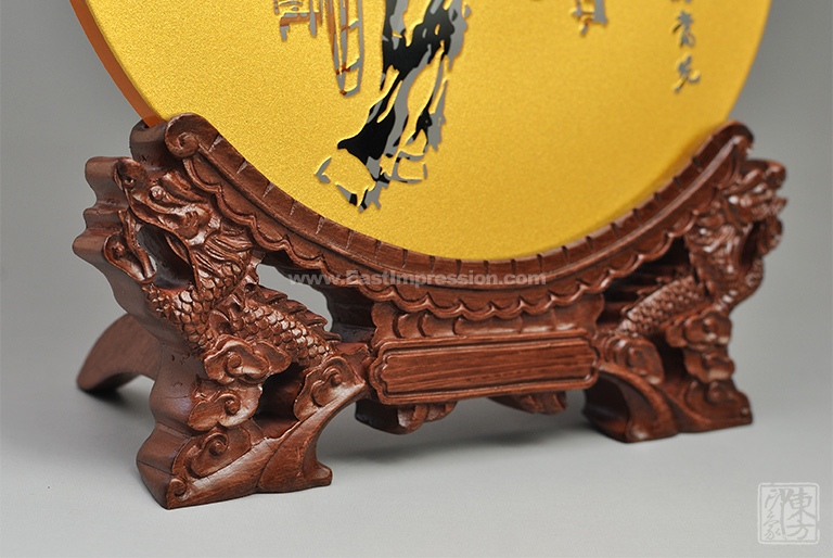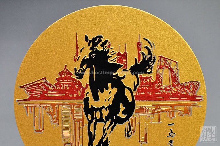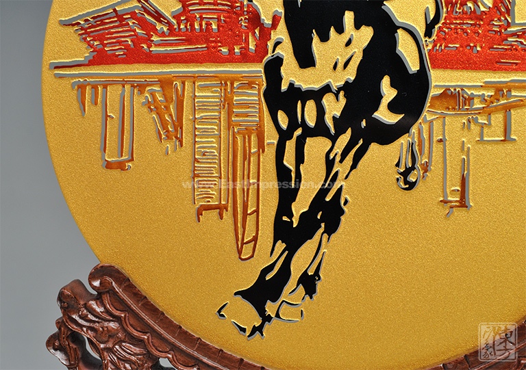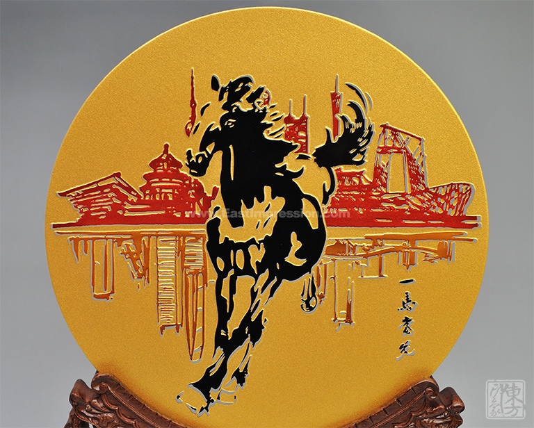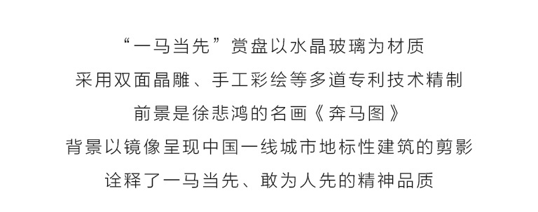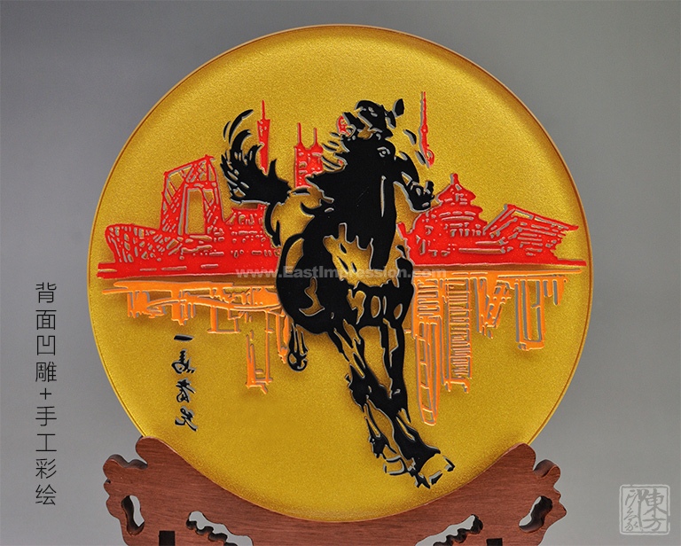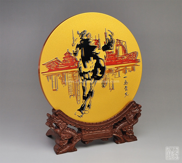 “一马当先”赏盘以纯正的富贵金衬底,在对称的玻璃表面精雕细刻,形成了奇妙的镂空现象。