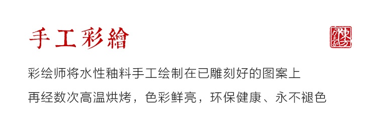 由彩绘师将水性釉料手工绘制在已雕刻好的图案上,再经数次高温烘烤,色彩鲜亮夺目,具有环保健康、安全无毒、永不褪色的特点。