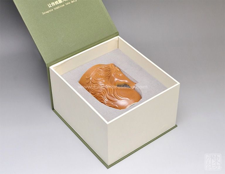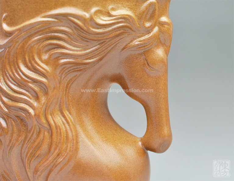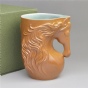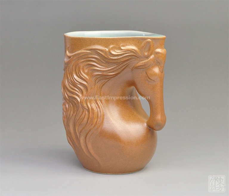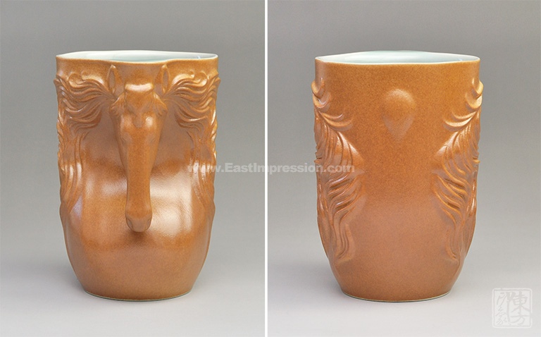 杯子的器型由一尊马头衍生而来,马的前额与面脊部巧妙形成杯把手。马双目微闭,低头沉思,给人以宁静、蓄势待发的力量;浓密的鬃毛飘逸飞扬,则给人以流畅与灵动的美感。