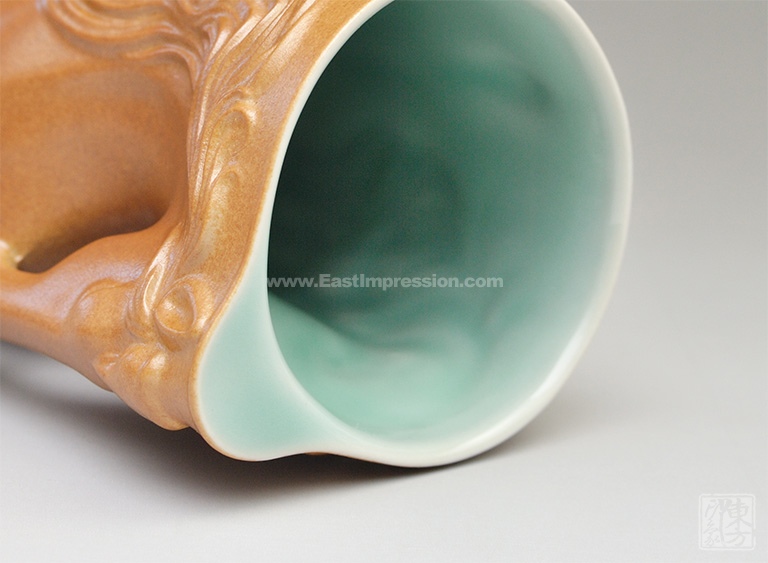 杯子外壁马头肆意飘扬的鬃毛如浅浮雕般凹凸起伏,草木灰釉呈现的棕黄色,恰如其分的呈现了马粗犷原始的气息。杯子内壁的天青釉,犹如一潭春水,莹润静谧。动与静、拙朴与宁静,巧妙融合在一起。
