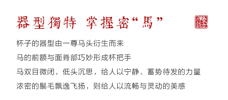 单手掌即可握杯身,浅浮雕般的鬃毛增加了握持杯身的摩擦力,掌握密“马”,由此得名。