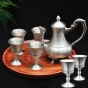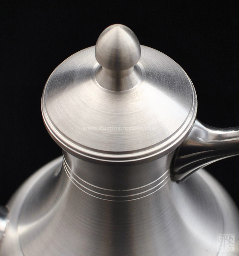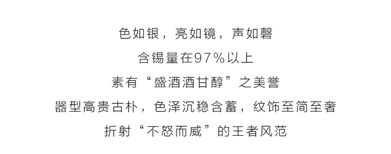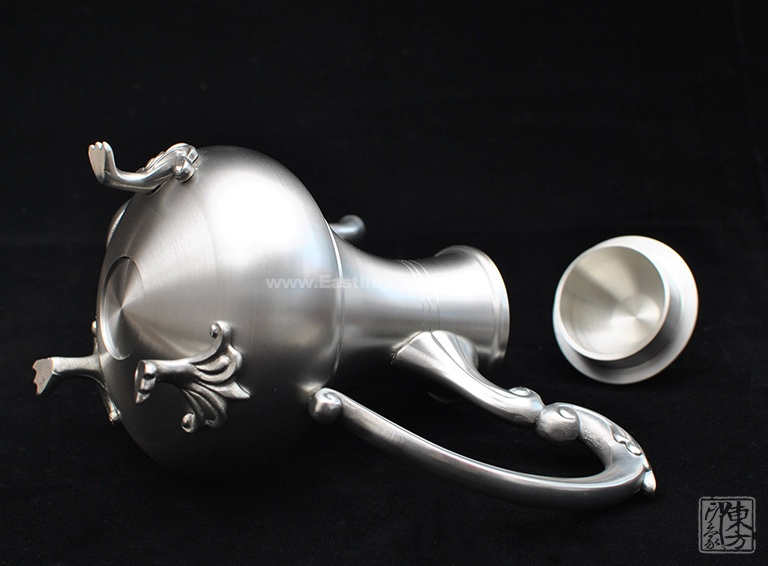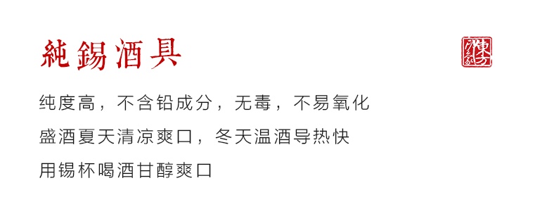 这是一款纯锡酒具套装,含锡量在97%以上(其余为安全的铜锑合金,锡质地本身柔软需加入其他适量的金属元素方能成形),纯度高,不含铅的成分,无毒,不易氧化。在日本宫廷中,精心酿制的御酒都是用锡器作为盛酒的器皿,盛酒冬暖夏凉,淳厚清冽,用锡杯喝酒甘醇爽口。