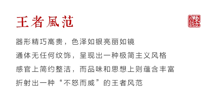 该款酒具套装器形精巧高贵,色泽如银亮丽如镜,通体无任何纹饰,呈现出一种极简主义风格。感官上简约整洁,而品味和思想上则蕴含丰富,折射出一种“不怒而威”的王者风范。