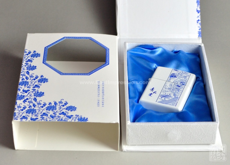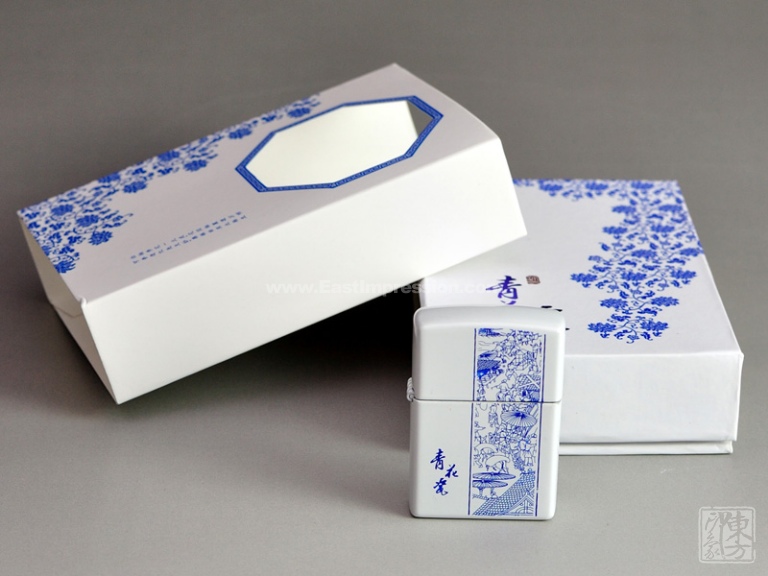 国色当如青花,不与世俗争繁华。该款青花打火机以“清明上河图”为主题装饰,纹样栩栩如生,色泽清新淡雅。礼盒和封套均以青花“缠枝莲”为主题纹样,复古八角窗的设计古朴典雅,缠枝莲蔓延窗棂,别具韵味。