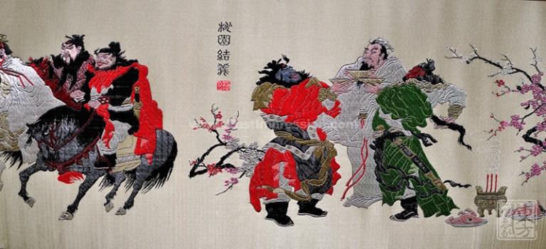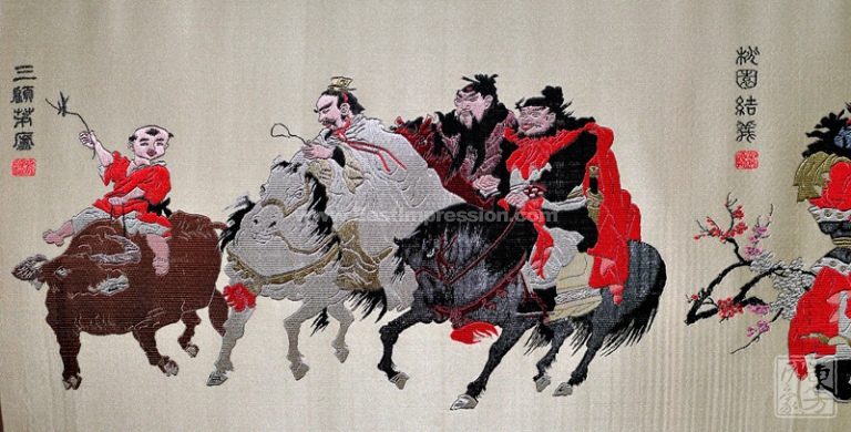 “桃园三结义”的故事,罗贯中把它放在《三国演义》开篇的第一回“宴桃园豪杰三结义斩黄巾英雄首立功”中,文中描写到刘焉出榜招募义兵,榜文行到涿县,引出涿县中一个英雄刘备,然后巧然的机会刘备认识了张飞和关羽,三个人志趣相投,一见如故,结为兄弟。在文中结尾描述三人焚香再拜而说誓曰:“念刘备、关羽、张飞,虽然异姓,既结为兄弟,则同心协力,救困扶危;上报国家,下安黎庶。不求同年同月同日生,只愿同年同月同日死。皇天后土,实鉴此心,背义忘恩,天人共戮!”誓毕,拜玄德为兄,关羽次之,张飞为弟。