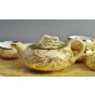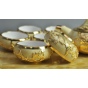 镀金锡镶工艺又称“金镶玉”,据北京故宫收藏及威海市志记载由威海新和成锡铺创制于清朝末年,是威海市独具特色的传统工艺。它是以纯锡为材料,经过冶炼、提纯、浇铸、錾刻等工艺,将纯锡制成带有图案的锡片,然后镶嵌在玉石、陶瓷、紫砂、琉璃等工艺品表面,再经过焊接、打磨、抛光、镀金等数十道手工工艺制作而成。