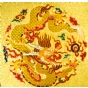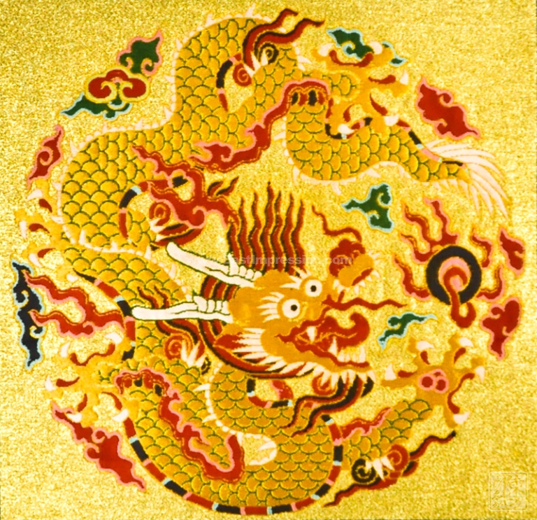 “祥龙逐日”的构图呈圆形,图案雄浑华美,设色对比强烈,以金丝线织成金宝地,同时以大量金丝线勾边或金丝线装饰图案,体现了云锦喜用金的显著特色。晕色和谐,织品金碧辉煌,绚丽夺目,从不同角度欣赏呈现出奇异变幻的艺术效果,同时具有鲜明的中国吉祥文化的深厚底蕴。