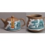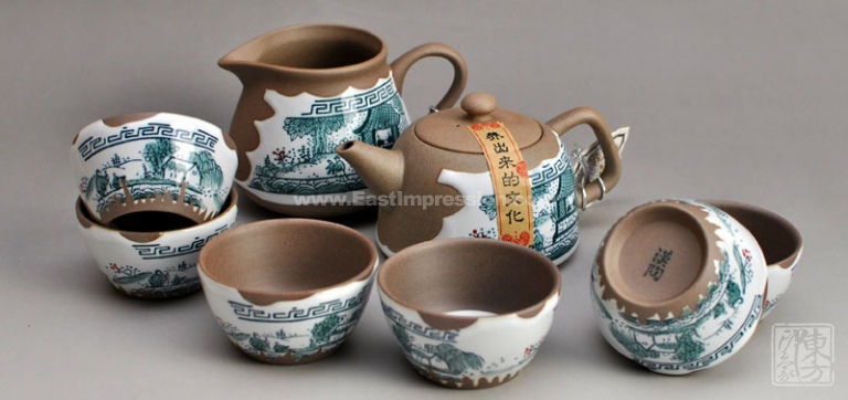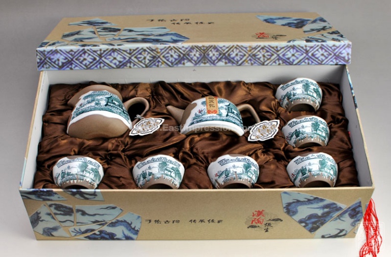 该手绘青花陶茶壶套装小巧精致,色彩淡雅幽菁可人,华而不艳,手绘人物、小鸟、房屋、风雪、梅花,清馨雅致,渲染出浓郁的中国水墨画的意境。把在手中,一股茶香飘然而至。