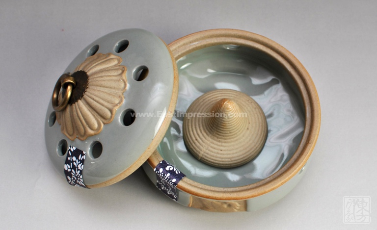 此款檀香炉精选土质细、粘性小、耐久性强、具有良好可塑性的原矿陶土,经过淘泥、摞泥、拉坯、印坯、修坯、捺水、画坯、上釉等数十道工序,再经高温烧制。龙泉釉是以氧化铁为着色剂,在生坯上多次施釉,再在还原气氛中以高温烧制,以达到釉厚色深的效果。