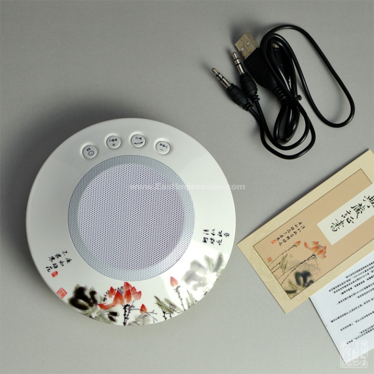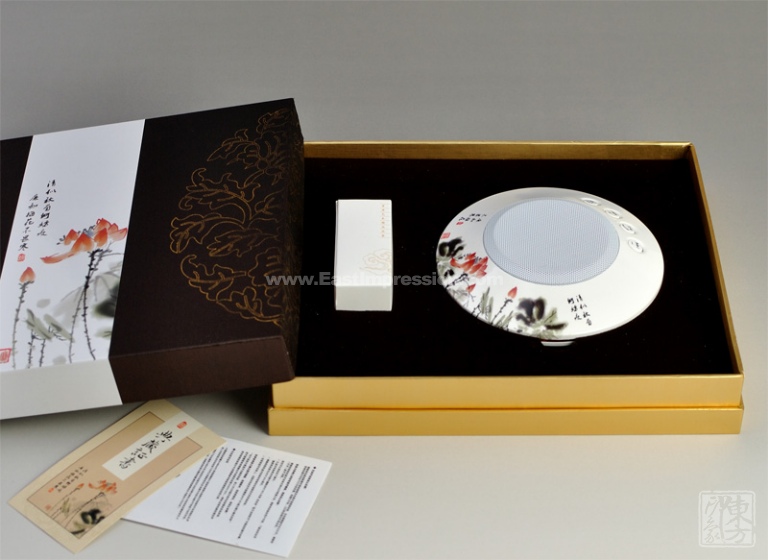 该音响造型时尚科幻,犹如传说中的飞碟般神秘和新颖。质感光润洁白,以国画墨荷作为主题装饰,水墨阔笔铺染的荷叶浓淡相宜,几株荷花濯然独立,亭亭静直,或含苞欲放,或精彩绽放。古色古香的东方元素与现代时尚科技有机融合,带来卓越的视听体验。