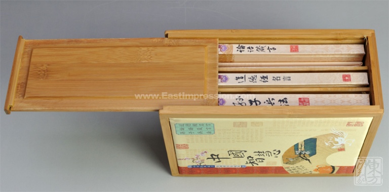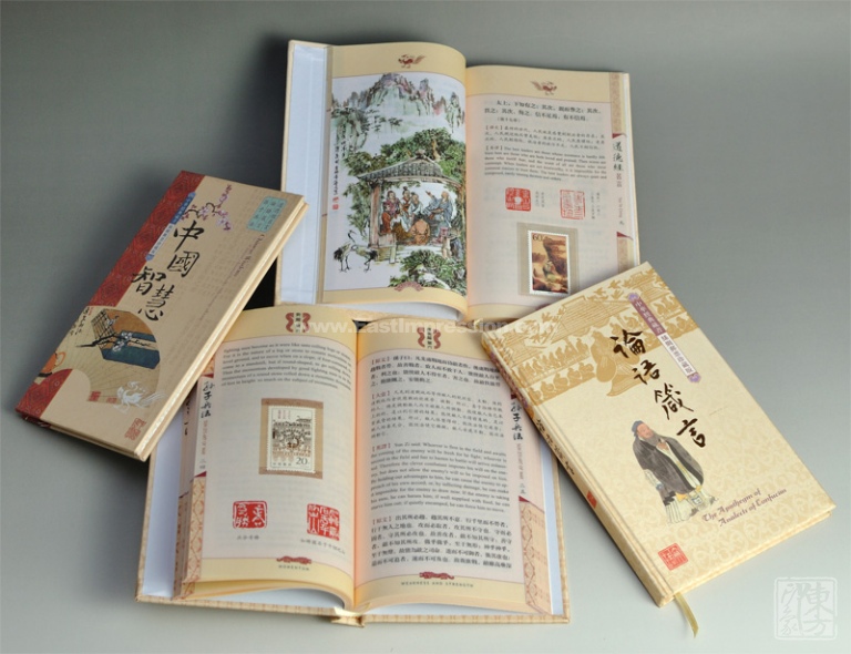 丝绸邮票珍藏版《论语箴言》(中英文版),内文以中华书局出版的《论语注释》为底本,并辅以英国大汉学家理雅各(James Legge)的英语翻译。书中精选了明代画家仇英所绘的《孔子圣绩图》作为插图。同时,在书中还选配了国家邮政局发行的“三孔”特种邮票,作为此经典读本的绝妙搭配。