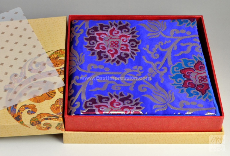 该款抱枕/靠垫套以宝蓝为底色,缠枝莲纹样作四方连续排列,花纹硕大饱满,布局丰满有序。宝蓝与金、五彩设色对比强烈,织品典丽浑厚、金彩辉映。仿古老的手工妆花技艺,不仅展现了云锦喜用金的显著特色,而且从不同角度欣赏呈现出奇异变幻的艺术效果,细看图案还具有特殊的浮雕镶嵌式的立体效果。