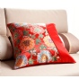 该款抱枕/靠垫套的图案部分为仿手工妆花云锦的织锦缎,真丝含量为50%桑蚕丝。在中国红的缎底上织出五彩缠枝莲纹样。缠枝莲纹样大量使用金线勾边或者以金线装饰花纹,展现了云锦大量用金的显著特色。