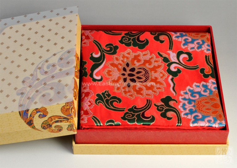 该款抱枕/靠垫套以中国红为底色,缠枝莲纹样作四方连续排列,花纹硕大饱满,布局丰满有序。中国红与金、五彩设色对比强烈,织品典丽浑厚、金彩辉映。仿古老的手工妆花技艺,不仅展现了云锦喜用金的显著特色,而且从不同角度欣赏呈现出奇异变幻的艺术效果,细看图案还具有特殊的浮雕镶嵌式的立体效果。