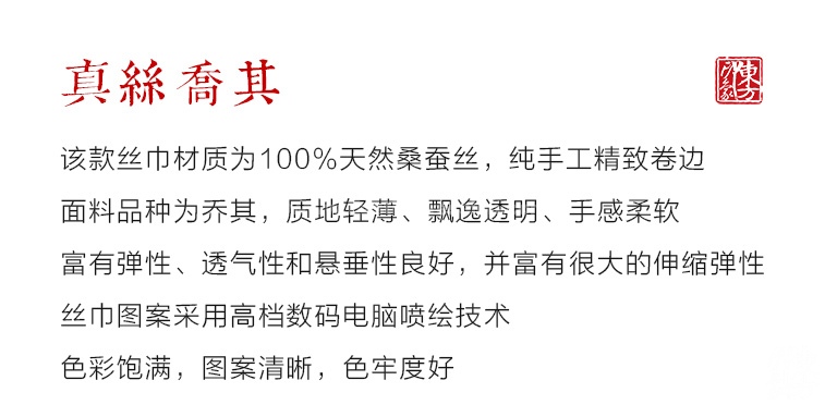 真丝面料品种大致有双绉、重绉、乔其烂花、乔其、双乔、重乔、桑波缎、素绉缎、弹力素绉缎、经编针织等几大类。优秀的品牌在面料染整工艺处理中,均依赖于高科技的生产工艺流程,采用环保型染料,色牢度达3--4.5级。在让人们欣赏丝绸面料独特的色彩美感的同时,保持了丝绸面料的营养性和自然性。在面料后处理过程中还进行不同程度的预缩处理,以保证所用面料的成衣缩水率在0.5-3%。