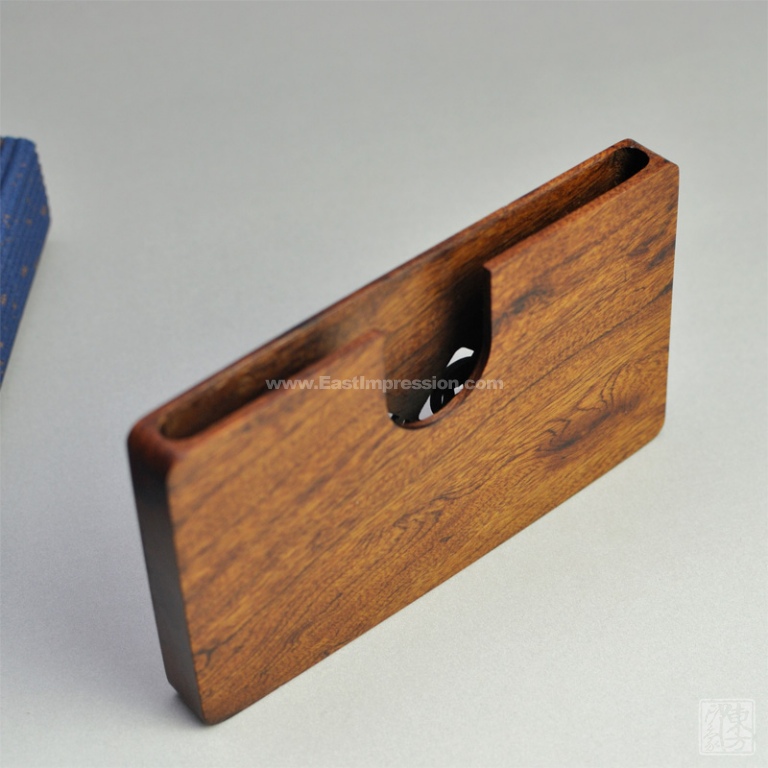 以非洲酸枝为材质,正面镂空雕刻四种经典吉祥纹样,背面U型槽口便于名片抽取。非洲酸枝木,学名古夷苏木,拉丁名:Mopane ,是南部非洲最重的木材之一,其密度和耐久性其他木材几乎无可匹敌,稳定性高,耐虫蛀。心材明显,红褐紫色或红褐色,具深紫色条纹。
