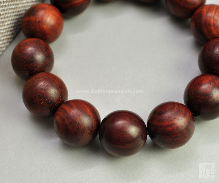 一串盘好的小叶紫檀佛珠,应该呈高贵的紫色,纹理深沉且清丽异常,傲于所有木材之首,古之曰:“紫气东来”!而这种色泽,被称为“包浆”。