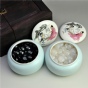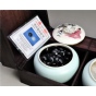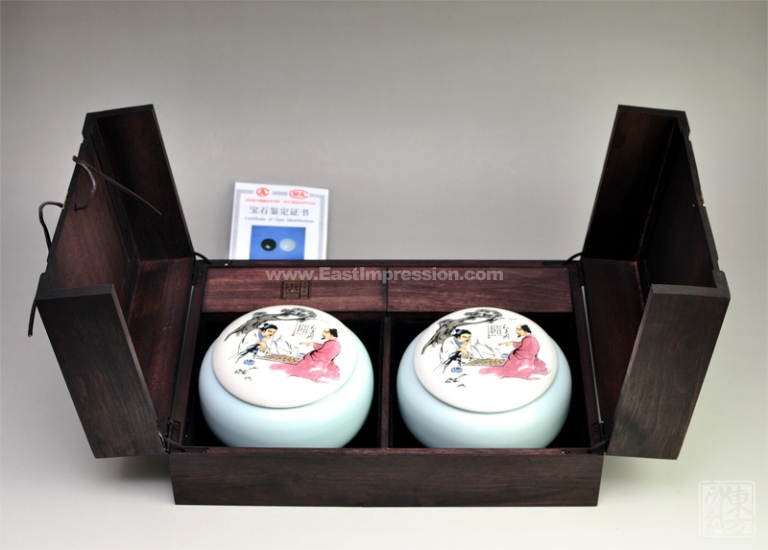 放置棋子的罐子为陶瓷罐。罐体施青釉,罐盖釉上彩绘“对弈图”。