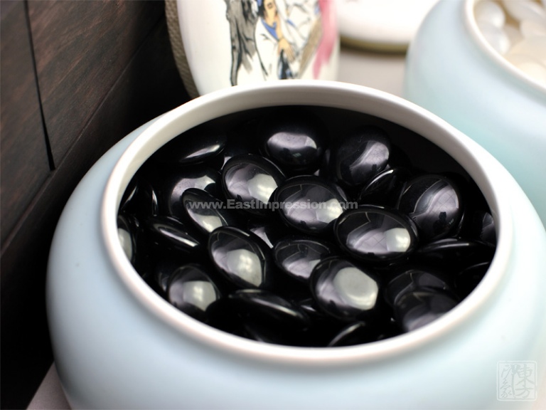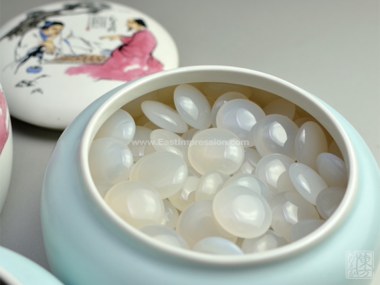 黑白棋子为天然玛瑙。色彩纯正柔和,纹路流畅清晰,可见自然水线或“云彩”,光泽度和透明度好,触感光滑细腻,温润可人。