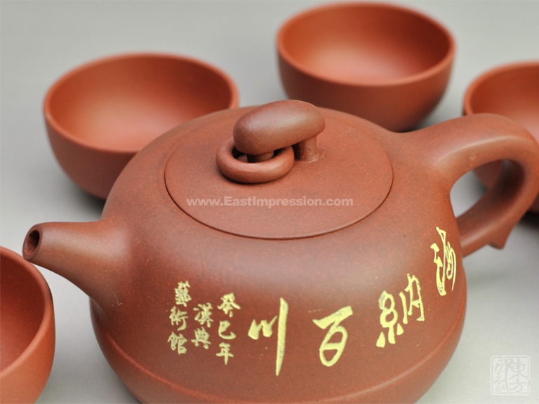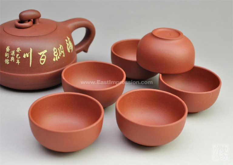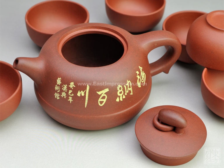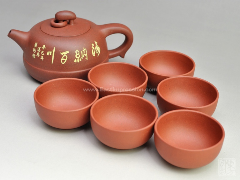 该套紫砂茶具精选宜兴原矿红清水泥,由资深制壶老艺人手工成型。泥色醇和尔雅,原创器型敦厚稳重,与其铭文“海纳百川”的胸怀、气度十分吻合。文人气息浓郁,无论品茗养生还是礼赠都堪称上选。
