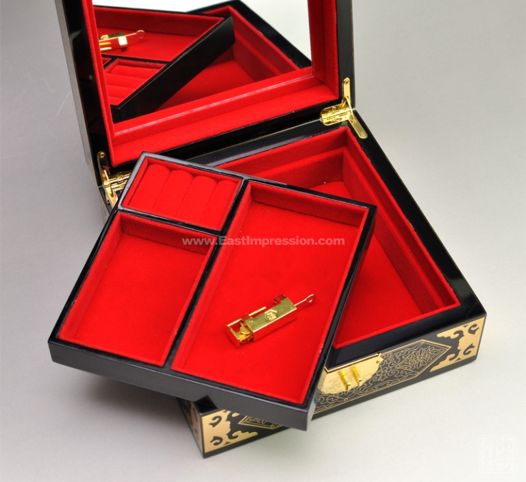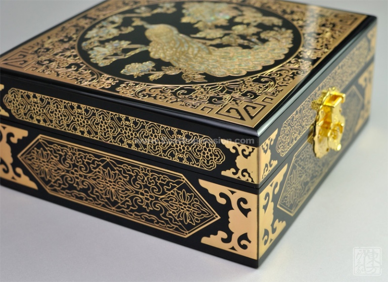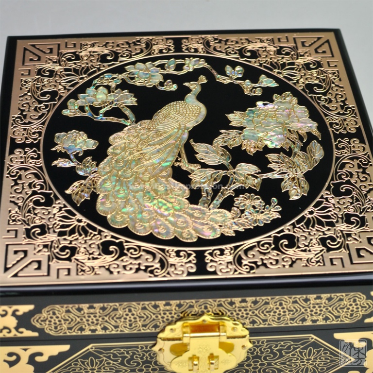 天水漆器掐铜丝嵌螺钿高档首饰盒:凤戏牡丹图(黑)