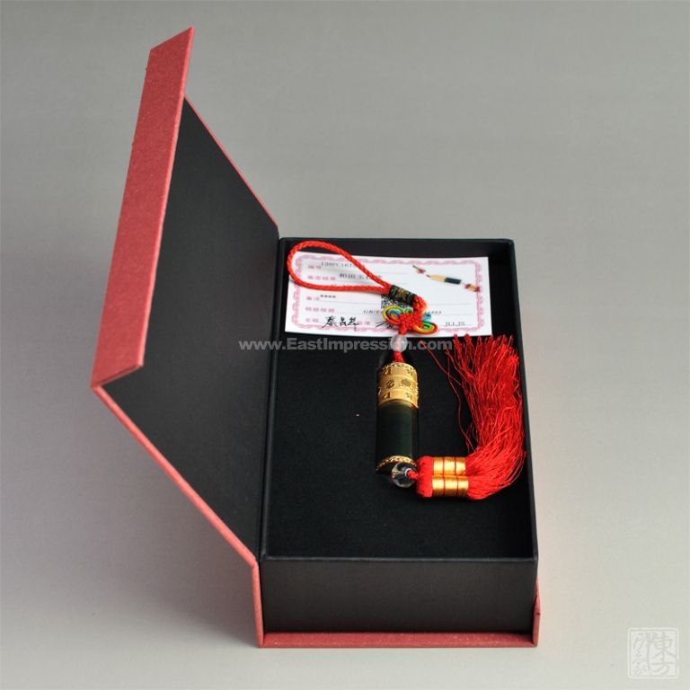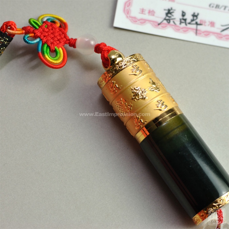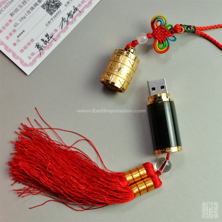 该款U盘挂饰内置东芝原装品牌芯片,外壳精选和田青玉镶接纯铜镂雕“六字大明咒、八吉祥”镀24K金。和田青玉在和田玉中是硬度最高的,玉质细腻温润、玉色深重且纯正一致,整体呈现刚劲之气,寓意着基业长青,历代封建王朝的传国玉玺均为青玉材质,所以玉器专家都称和田青玉为“帝王之玉”。