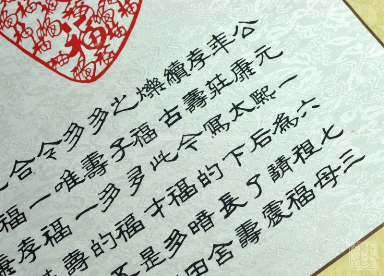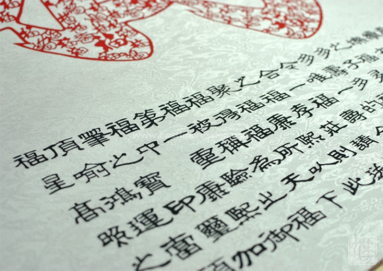 更让人叫绝的是,此福与民间称作“衣禄全、一口田”的福字截然不同,其间包括了数个汉字。右上角的笔画像个“多”字,下边为“田”,而左偏旁极似“子”和“才”字,右偏旁像个“寿”字,故整个“福”字又可分解为“多子、多才、多田、多寿、多福”,巧妙的构成了福字的含义,极富艺术性,且意味深长,是古往今来、独一无二的“五福”合一之“福”字。由于其中的“田”部尚未封口,因此是鸿福无边、无边之福。孝庄太后称其为“福之本源”,民间则称其为“五福之本、万福之源”。