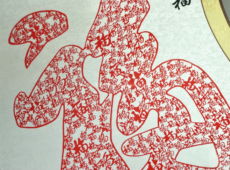 该款剪纸画为单色剪纸,最能体现剪纸本源的艺术特色。大福取材于康熙御笔“天下第一福”,其中嵌含的百福,字形无一雷同,且笔笔相连不断,不仅展现了犀利精湛的技艺价值,而且蕴含了鸿运当头、福星高照的美好祝愿。