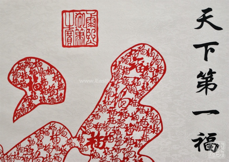 杨柳青剪纸成为继驰名中外的杨柳青年画之后又一朵民间艺术奇葩。《天下第一福》为单色剪纸,取自康熙御笔,它将剪、刻相结合的刀味、“天下第一福含百福”犀利精湛的手艺有机地融合,传递着送福得福、五福俱全的美好祝愿。