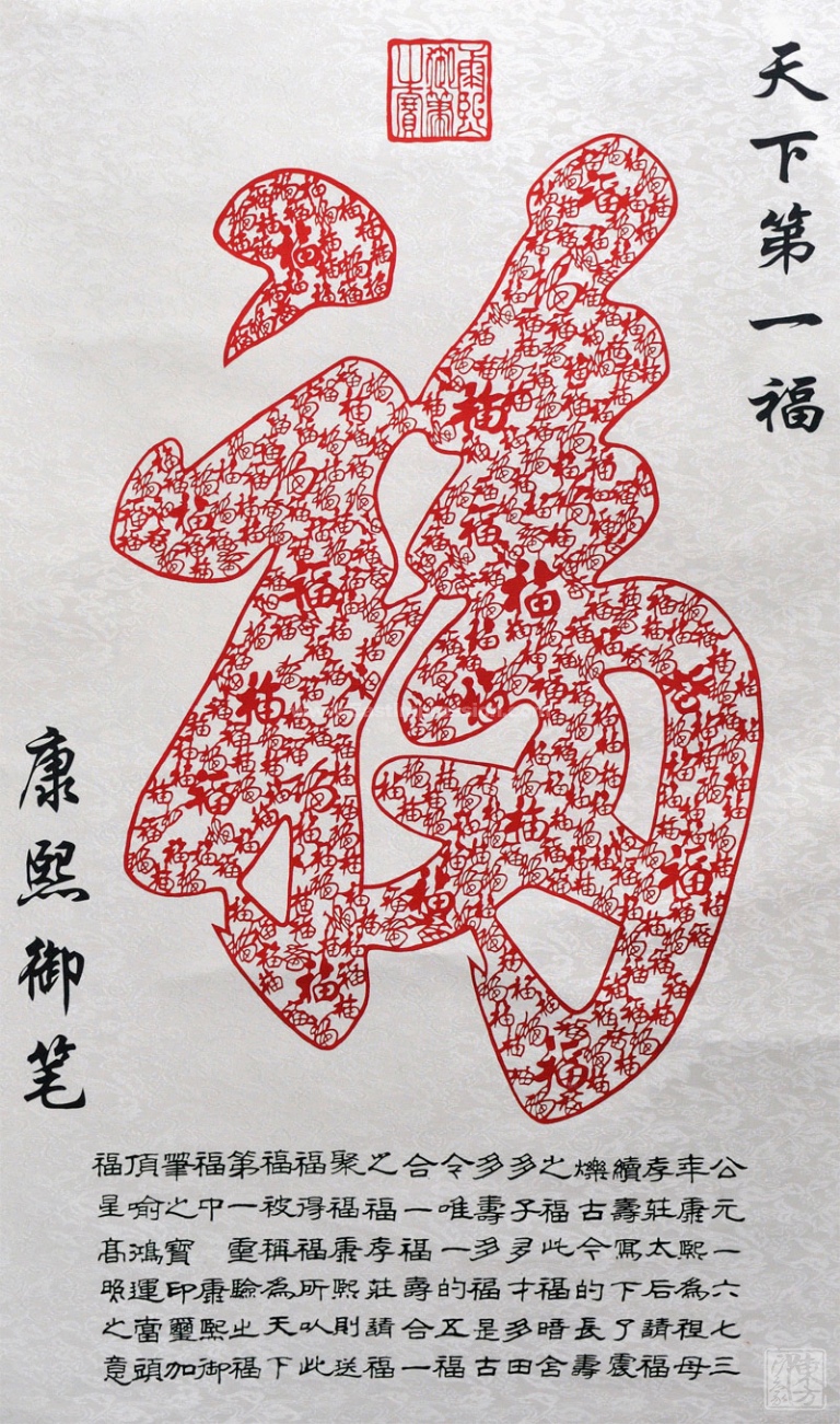 康熙所书的这个“福”字,不同于民间常用的饱满方正,字形窄而狭长,为瘦(音谐“寿”),民间称之“长瘦福”,即长寿之福。俗语说“有福必有寿,有寿必有福”。但是,由于“福”、“寿”二字字形差异太大,自古以来还没有哪个书法家可以把“福”“寿”二字合为一字书写。而此福字右半部正好是王羲之《兰亭序》中“寿”字的写法,成为了现存历代墨宝中惟一的将“福”“寿”写在同一个字里的福字,被民间称之为“福中有寿,福寿双全”。由于其上加盖了“康熙御笔之宝”的印玺,因此也成为了中国乃至世界惟一一枚不可倒挂的“福”字。