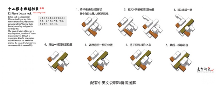 鲁班锁,这种三维的拼插器具内部的凹凸部分(即榫卯结构)啮合,十分巧妙,外观看是严丝合缝的十字方盒结构,中心形成空间。一般都是易拆难装,拼装时需要仔细观察,认真思考,分析其内部结构,不得要领,很难完成拼合。