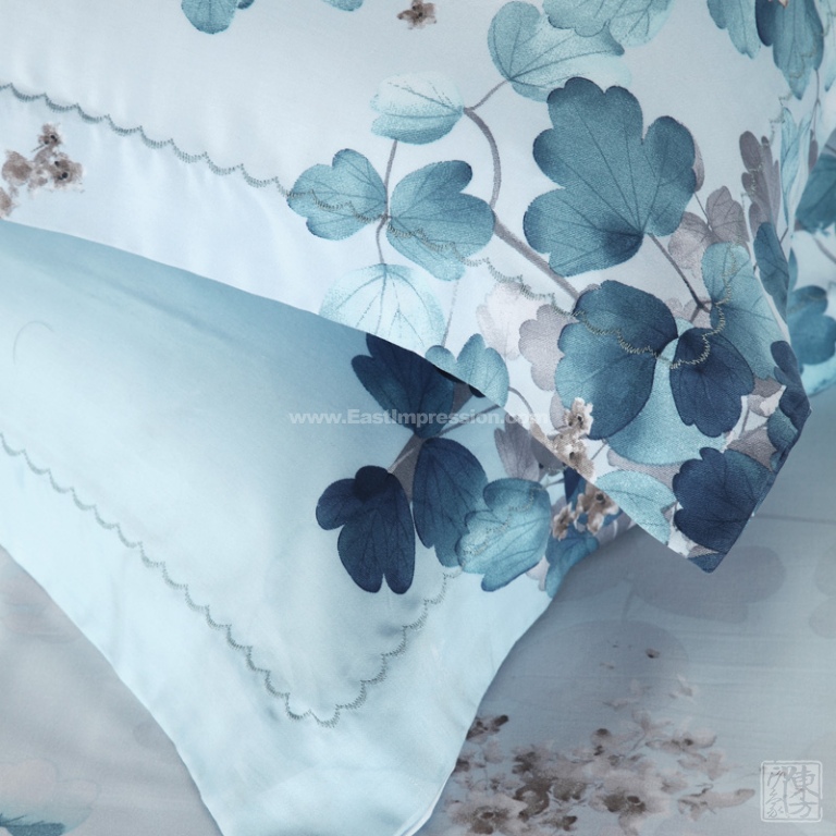 该床上四件套的印花图案独辟蹊径,不以花团锦簇为主题,反而着重渲染了枝繁叶茂的视觉效果。看似留白的地方实际上仍有大片枝叶和花朵淡淡映衬,给人一种“镜中花水中月”的错觉。在材质上突出一个“绿”字,精心选用“绿纤维”——天丝制作而成,色泽上则以水墨蓝为主色调,呈现出一派沉静素雅的景象。