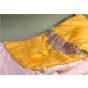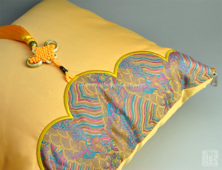 抱枕外套是鲜明活泼的明黄色,上部边沿以精致细腻的织锦“江崖海水纹”“如意云纹”装饰,下坠手工编织的明黄色中国结挂饰,较大面积的纯色留白,在繁复与简约的对比中形成均衡之美,蕴含着吉祥如意的传统韵味。