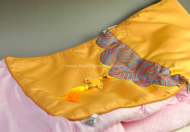 该款抱枕被以丝绸布为面料,以织锦吉祥纹样与中国结吊坠装饰。内芯采用进口丝绒,蓬松柔软,有着保暖防寒的功效。可一物多用,叠起可作靠垫和抱枕,铺开可作休闲被。明黄色泽夺目尊贵,触感光滑亮丽,明快繁丽的古典设计见之则喜。