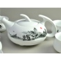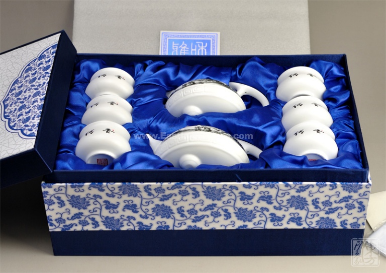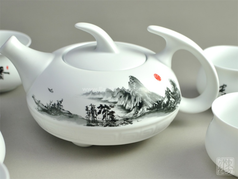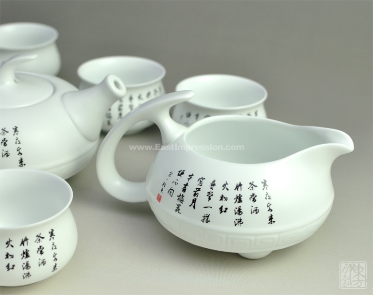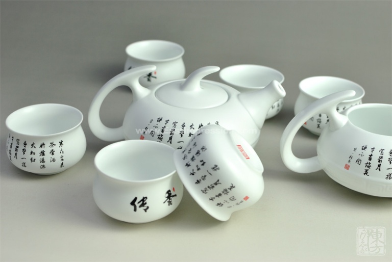 该套茶具采用德化羊脂玉瓷,德化窑是饮誉中外的名窑。羊脂玉瓷洁白滋润,似凝脂,如美玉。在阳光照射下,呈半透明猪油状乳白色泽,故称“羊脂玉”。羊脂玉瓷烧制难度很高,工艺复杂,在烧制多件中才能出一件,成品率低而更加珍贵。表面施哑光釉,富春山居图和古诗词采用釉上贴花的装饰技法经高温烧制,花面附着牢固,永不褪色。