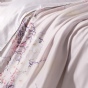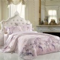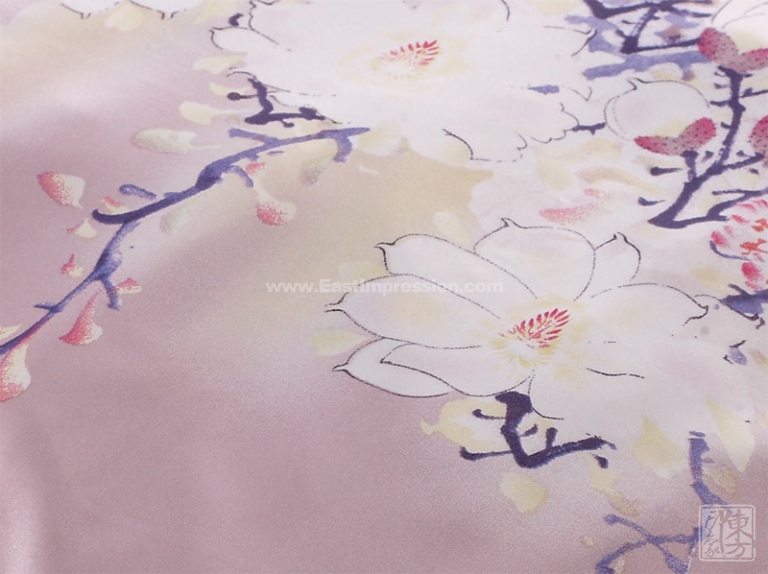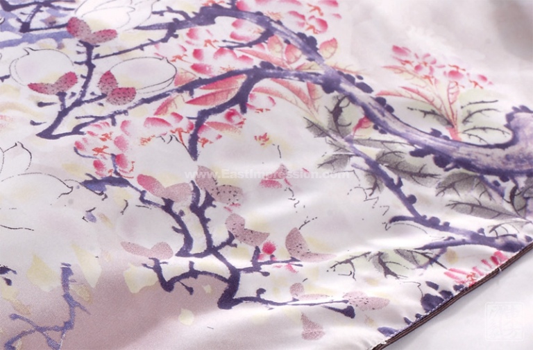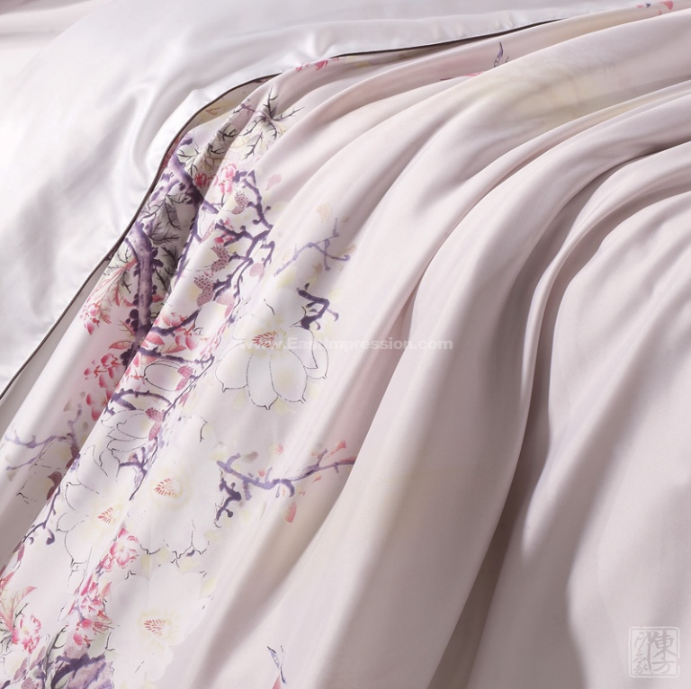 该四件套表面为滑爽轻盈的真丝面料,内里为柔软舒适的纯棉面料,采用环保型活性手绘印染工艺精制而成,对人体具有极佳的保护功能。图案则采用手绘的水墨写意花鸟图,画面繁花似锦,格调清丽鲜活,明媚春色令人神往。