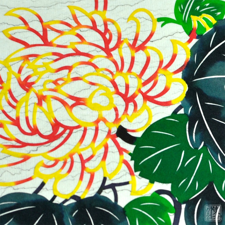 四幅点彩剪纸画分别以“梅兰竹菊”为主题,构图疏密有致,蔚县剪纸细致入微的精湛刀工令人叹服,浑厚中有细腻,纤巧里显质朴。独特的点染工艺赋予花鸟昆虫生动鲜活、绚丽多姿的形象,色彩搭配上讲究冷暖对比、近色和谐,配以颂咏四君子的名辞佳句,别有一种欢快、明朗、清新的情趣。