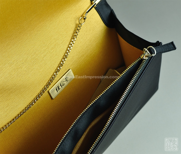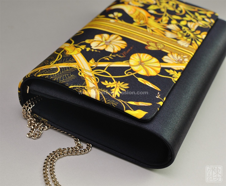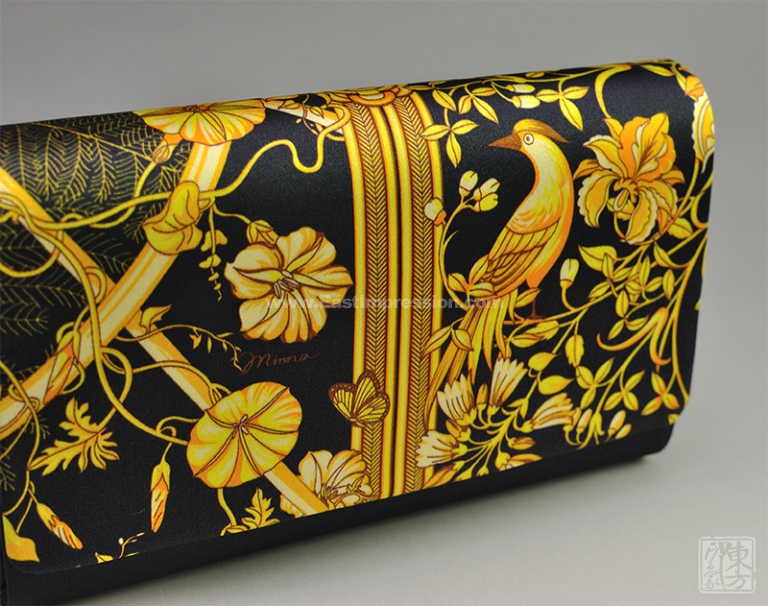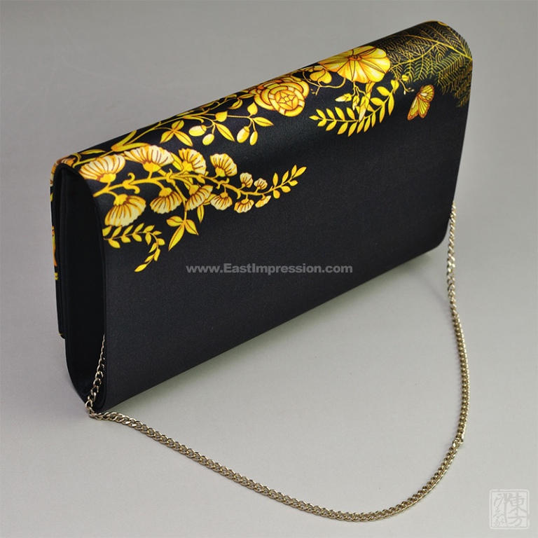 该款手包以优质头层牛皮为内质,表面以5A级100%桑蚕丝素绉缎面料包覆,里料为100%粘纤,内部双层结构,容量较为宽裕。主题纹样“万缘之园”采用天然环保的活性染料及台版印花、生物酶后整理技术,使其颜色更加均匀鲜亮。金属拎手采用纯铜材质,手包可拿可拎。运用纳米专利技术进行防水、防污、防油的三防处理,丝绸的华美质感和实用性能两者兼得。