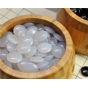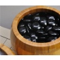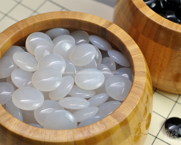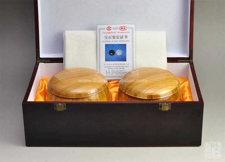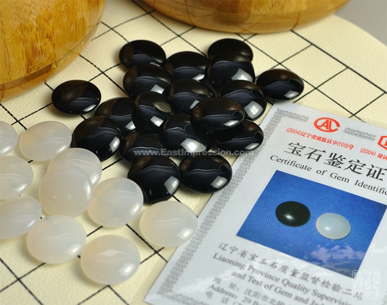 围棋的黑白棋子为天然玛瑙(附宝石鉴定证书)。棋子双面微凸,弧线优美,执拿方便,国际流行。在棋盘上更具立体感,尤其刚落子时,微微晃动感令人着迷。玛瑙棋子色彩纯正柔和,纹路流畅清晰,可见自然水线或“云彩”,光泽度和透明度好,触感光滑细腻,温润可人。