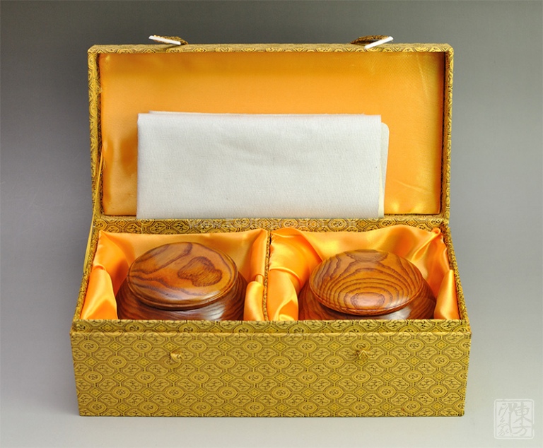枣木棋罐(宽13×高9.5cm);锦盒(长36×宽18×高13.5cm);纸质礼袋