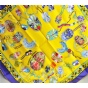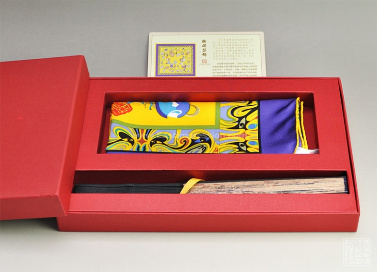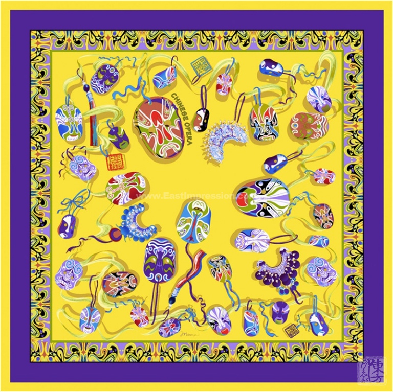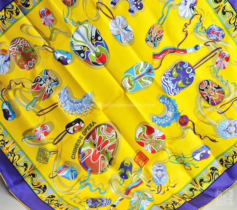 以5A级100%桑蚕丝为原料,面料为真丝斜纹绸。主题图案“脸谱集锦”采用天然环保的活性染料及台版印花、生物酶后整理技术,使其颜色更加均匀鲜亮。纯手工密针卷边,细节处见精致。