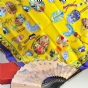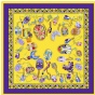 丝巾真丝斜纹绸的面料具有“柔而有骨”的特点,在实际运用中更易于造型。丝巾明黄色调华贵亮丽,选取不同京剧人物脸谱通过打散构成的方法,展现了国粹艺术的多姿多彩。折扇是风雅之物,印制元初大家赵孟頫的《鹊华秋色》,是画史上文人画风式青绿山水设色的经典。丝巾与折扇的组合,无论从类别还是表现内容,均集中体现了中国文化的精髓。